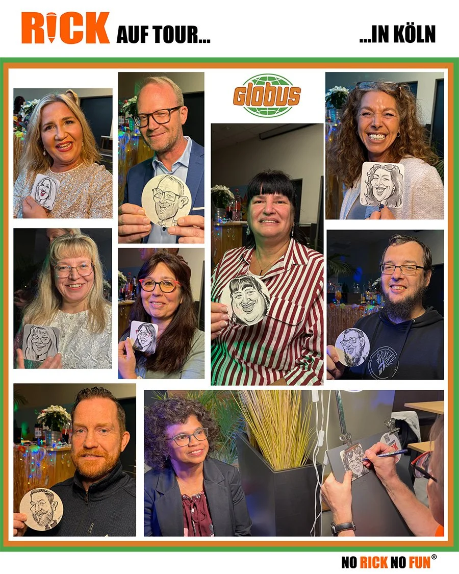 Hier zeichnete RICK die Karikaturen auf Wunsch des Kunden statt auf DIN A3 4 Nummern kleiner auf DIN A5-Größe. Superflott karikierte er in Höchstgeschwindigkeit und das begeisterte alle Mitarbeiter.