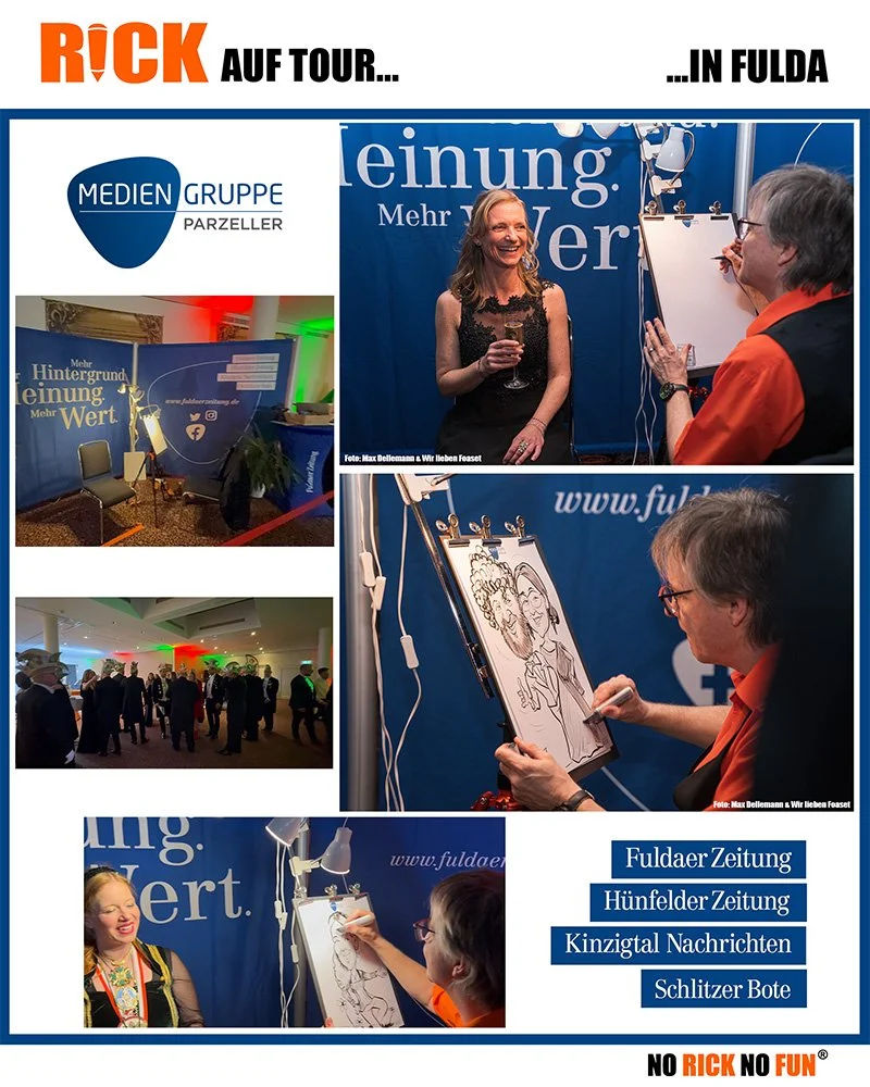 Auf dem festlichen Ball der Stadt Fulda durfte ich für einen Zeitungsverlag live auf Papier zeichnen. In stilvoller Atmosphäre entstanden klassische Karikaturen der Gäste – Persönlichkeiten aus Gesellschaft, Kultur und Karneval, fein beobachtet und mit dezenter Handschrift festgehalten.